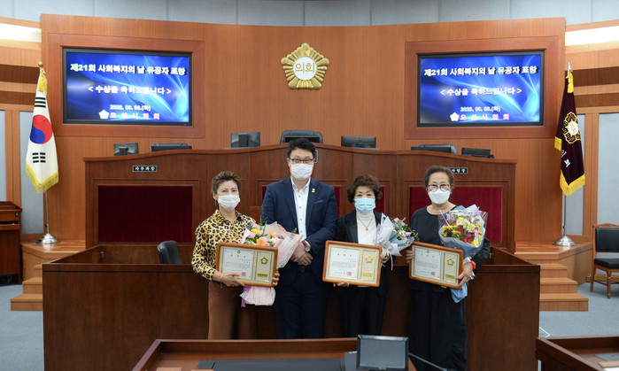 [오산=김정수 기자] 경기 오산시의회는 8일 의회 본회의장에서 '제21회 사회복지의 날'을 맞이해 그동안 이웃에게 따뜻한 마음을 전달하는 데 수고한 유공자 3명에게 표창장을 수여했다.