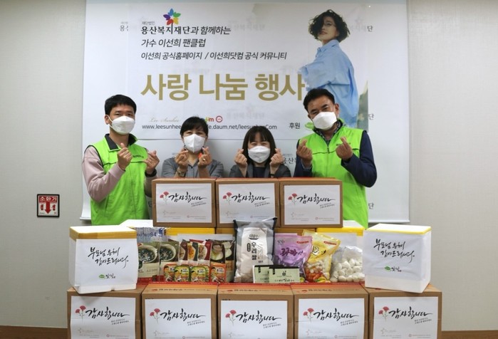 서울 용산복지재단은 지난 4일 가수 이선희 공식홈페이지·다음카페 이선희닷컴 공식커뮤니티와 농업회사법인 맛정(주)로부터 어버이날을 맞아 지역내 홀몸노인을 위한 후원품(부식·떡 20세트)을 전달받았다. 사진은 전달식에서 관계자들이 기념촬영을 하는 모습. (사진제공=용산구청)