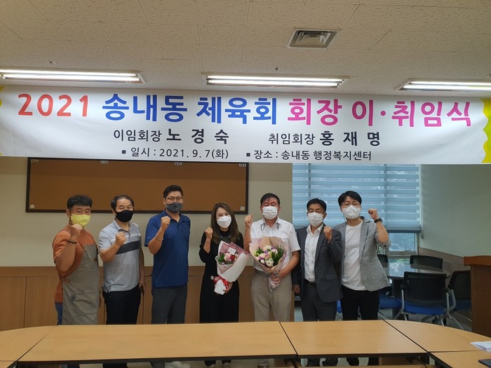 경기 동두천시 송내동 체육회는 7일 체육회장 이·취임식을 열어 노경숙 회장의 뒤를 이어 홍재명 체육회장이 취임했다. 사진은 이날 이·취임식에서 관계자들이 기념촬영을 하는 모습. (사진제공=동두천시청)