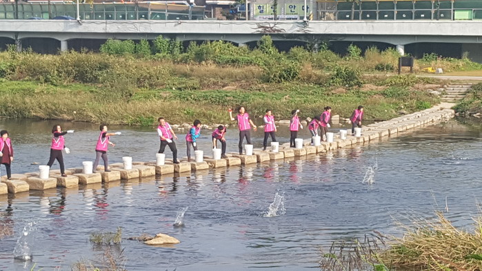 경기 동두천시 환경보호과 EM센터는 21일 EM아카데미 수료생과 EM을 사랑하는 모임 회원 20여명이 참석한 가운데 신천 동광교 하류 징검다리에서 수질 개선의 효과가 있는 2000여개의 EM 흙공을 투척했다. 사진은 흙공을 투척하는 모습. (사진제공=동두천시청)
