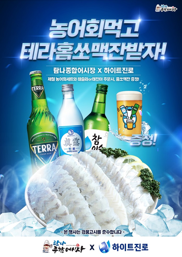 탐나종합어시장의 전 가맹점은 농어회, 테슬라(테라+참이슬) 혹은 테진아(테라+진로)을 주문하는 고객에 한해 홈쏘맥잔을 선착순으로 증정한다. 단, 해당 프로모션 조건은 매장별 상이할 수 있다.