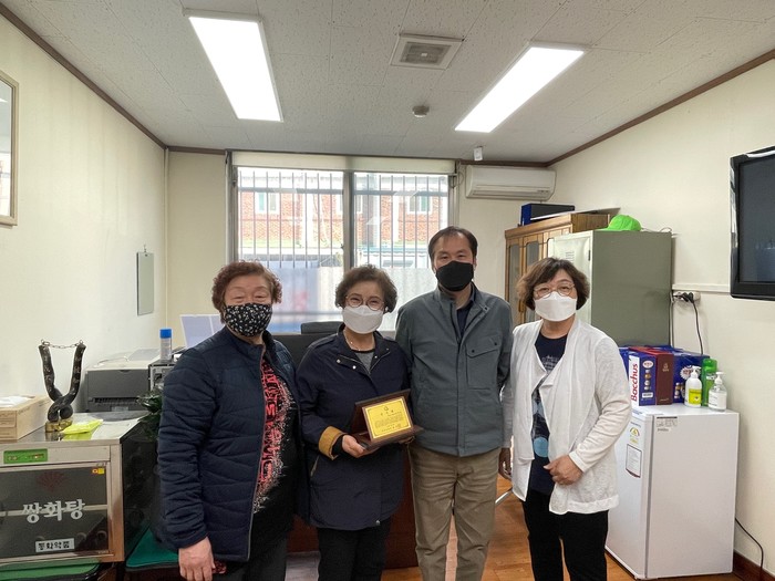 경기 동두천시 중앙동 행정복지센터는 최근 임기가 만료된 중앙동 안옥분 전 통장에게 감사패를 수여하고 통장 재직기간 행정의 최일선에서 최선을 다한 노고에 대한 감사의 뜻을 전달했다. 사진은 전달식에서 관계자들이 기념촬영을 하는 모습. (사진제공=동두천시청)