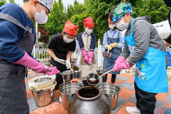 양천구는 최근 서울계남초등학교에서 메주를 이용해 장을 직접 만들고 발효시켜 먹는 과정을 통해 건강한 식습관 개선을 유도하는 ‘오감톡톡 건강스쿨 학교장독대’ 사업인 장담그기 체험교육을 진행했다. 사진은 장담그기 체험에 참여한 학생들이 소금물을 장독대에 담는 모습. (사진제공=양천구청)
