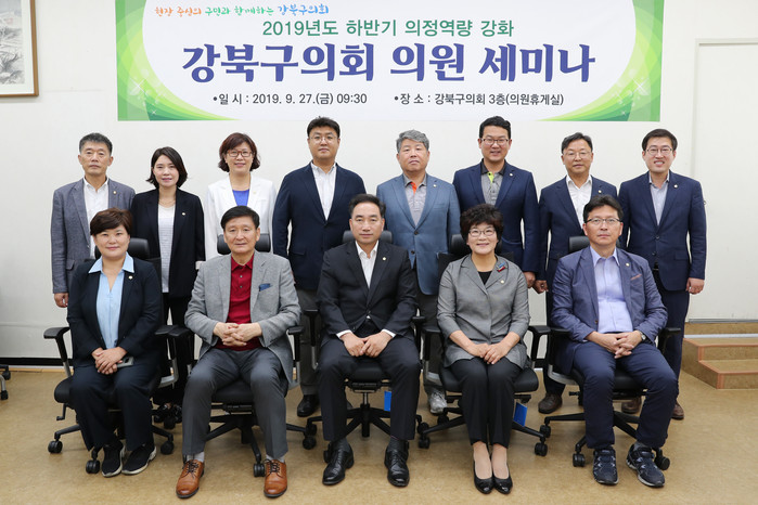 ▲ 최근 열린 의원 역량 강화 세미나에서 강의 후 이백균 의장(앞줄 가운데)과 의원들이 문두현 소장과 기념촬영을 하고 있다. (사진제공=강북구의회) |