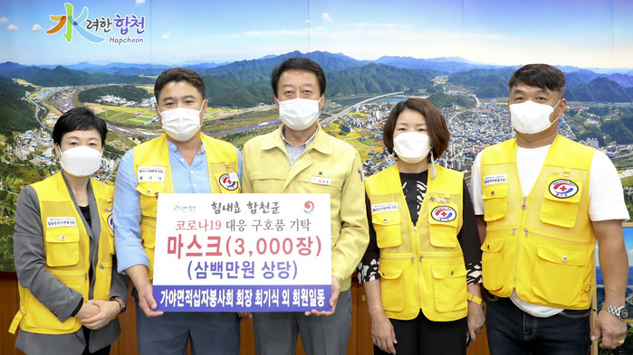 합천군 가야면 적십자봉사회(회장 최기식)는 14일 합천군청을 방문해 코로나19 지역발생 예방을 위해 써 달라며 마스크 3,000장(3백만원 상당)을 기탁했다.