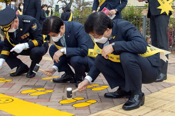2일 세종시 새움초등학교 정문에서 열린 '어린이 교통안전 합동 행사'에 참석한 최교진 세종시교육감(오른쪽)이 인근 횡단보도에 노란발자국을 직접 설치하고 있다. 노란발자국은 횡단보도 대기선 앞에 발자국 모양으로 어린이들이 안전하게 신호를 기다릴 수 있도록 유도하는 교통사고 예방 시설물이다.