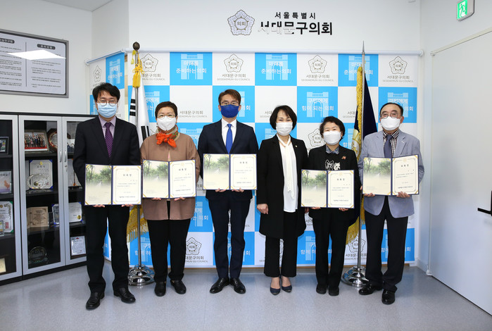 | ▲ 2020 회계연도 결산검사 위원 위촉식에서 박경희 의장(오른쪽 세 번째)이 위촉장을 전달한 후 위원들과 기념촬영을 하는 모습. (사진제공=서대문구의회) |