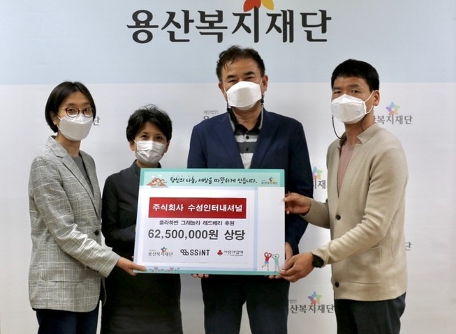 서울 용산복지재단은 24일 전자상거래업체 (주)수성인터내셔널으로부터 6250만원 상당 식품(플라하반 그래놀라 레드베리 400g·7449개)을 전달받았다. 재단은 기부받은 식품을 지역 취약계층을 위해 구 푸드뱅크마켓센터로 전달했다. 사진은 전달식에서 관계자들이 기념촬영을 하는 모습. (사진제공=용산구청)