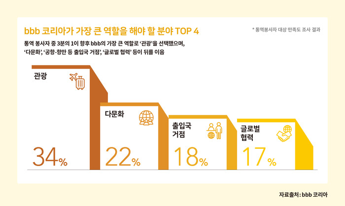 bbb 코리아는 2020년 변화하는 환경 속에서도 언어 문화 자원봉사에 적극 참여해준 bbb 통역 봉사자 대상으로 활동 만족도 조사를 실시했다. 코로나로 많은 것들이 바뀌었지만, 봉사자들은 bbb가 가장 큰 역할을 해야 할 분야로 역시 ‘관광(34%)’을 꼽았다. 응답자 중 3분의 1 이상이 향후 bbb의 가장 큰 역할로 관광을 선택했으며, ‘다문화(22%), ‘출입국 거점(18%)’, ‘글로벌 협력(17%)’이 그 뒤를 이었다. bbb의 통역 서비스가 한국 문화관광에 긍정적인 역할을 할 뿐만 아니라, 다양한 분야에서 한국 방문객들의 문화 이해를 도우며 만족도를 높이는 만큼 그 역할을 확대할 필요가 있다고 평가할 수 있는 대목이다.