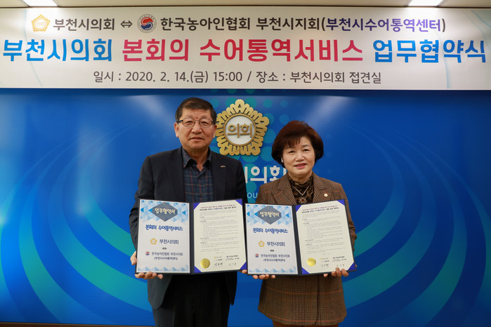 [부천=문찬식 기자] 경기 부천시의회는 최근 부천시수어통역센터(농아인협회 부천시지회)와 '본회의 수어통역 방송 지원을 위한 협약'을 체결했다.