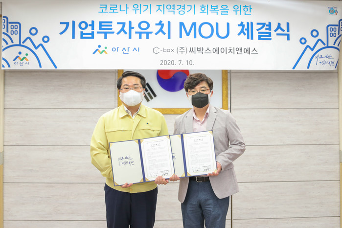 충남 아산시는 (주)씨박스에이치앤에스와 10일 시청에서 마스크, 방호복 등 코로나19 방역 물품 생산 제조설비(K-방역 클러스터) 구축을 위한 투자 양해각서(MOU)를 체결했다. 사진은 체결식 후 오세현 시장(왼쪽)이 박성봉 대표와 기념촬영을 하는 모습. (사진제공=아산시청)