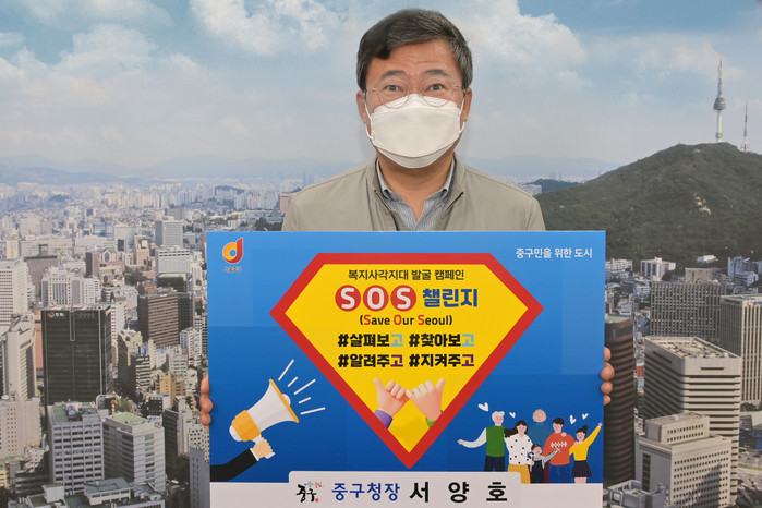 서양호 서울 중구청장이 24일 아동학대를 포함한 사회적 약자에게 가해지는 폭력을 방지하고 복지사각지대를 해소하자는 취지의 'S.O.S(Save Our Seoul) 릴레이 챌린지'에 동참했다. 사진은 서 구청장이 팻말을 들고 기념촬영을 하는 모습. (사진제공=중구청)
