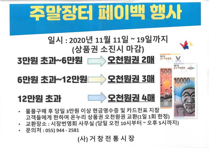 특히, 주말장터 페이백 행사는 시장 내 점포를 이용하면 온누리상품권 또는 거창사랑상품권을 되돌려 주는 행사로 1일 당일 합산 3만 원 이상 영수증을 시장번영회 사무실로 제출하면 6만 원까지는 1만 원, 6만 원 초과∼12만 원까지는 1만5천 원, 12만 원 초과부터는 2만 원 상당의 상품권을 지급한다.