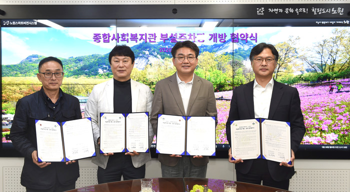 서울 노원구는 최근 지역내 종합사회복지관(공릉, 상계, 북부)과 함께 부설주차장 개방 협약을 체결했다. 개방 주차장 위치는 노원구 동일로 1127(공릉동) 외 2곳이다. 사진은 오승록 구청장(오른쪽 두 번째)과 복지관 관계자들이 기념촬영을 하는 모습. (사진제공=노원구청)