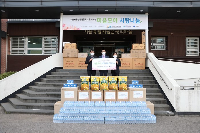 서울 은평구는 10일 (사)서울경제인협회 후원하는 ‘마음모아 사랑나눔 전달식’을 개최해 서울경제인협회 회원들이 모은 현금 310만원과 에어프라이어·쌀 등 600만원 상당의 물품을 노숙인요양시설인 은평의마을에 전달했다. 사진은 전달식에서 김미경 구청장(오른쪽)이 관계자들과 기념촬영을 하는 모습. (사진제공=은평구청)