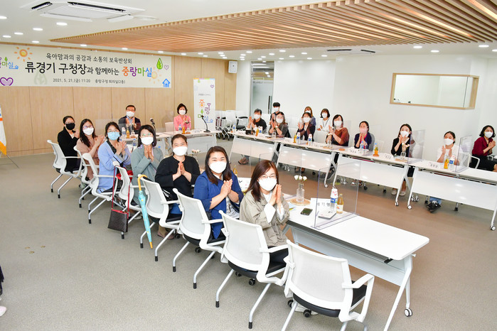 서울 중랑구는 최근 행복한 육아환경을 만들기 위한 제70회 중랑마실을 개최했다. 이번 중랑마실에서는 영·유아 부모 14명과 구 육아지원정책에 대한 의견을 교류하고 육아고충도 함께 나눴다. 사진은 이날 류경기 구청장과 영·유아 부모들이 기념촬영을 하는 모습. (사진제공=중랑구청)
