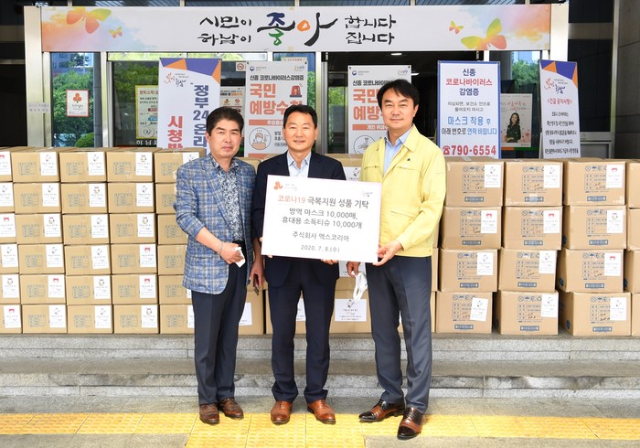 경기 하남시는 천현동에 위치한 마스크 제작 업체인 (주)맥스코리아로부터 최근 코로나19 극복을 위한 방역마스크 1만장(2900만원 상당)과 휴대용 소독티슈(1만개)를 기탁받았다. 사진은 기탁식에서 김상호 시장(오른쪽)과 맥스코리아 추봉식 대표 등이 기념촬영을 하는 모습. (사진제공=하남시청)