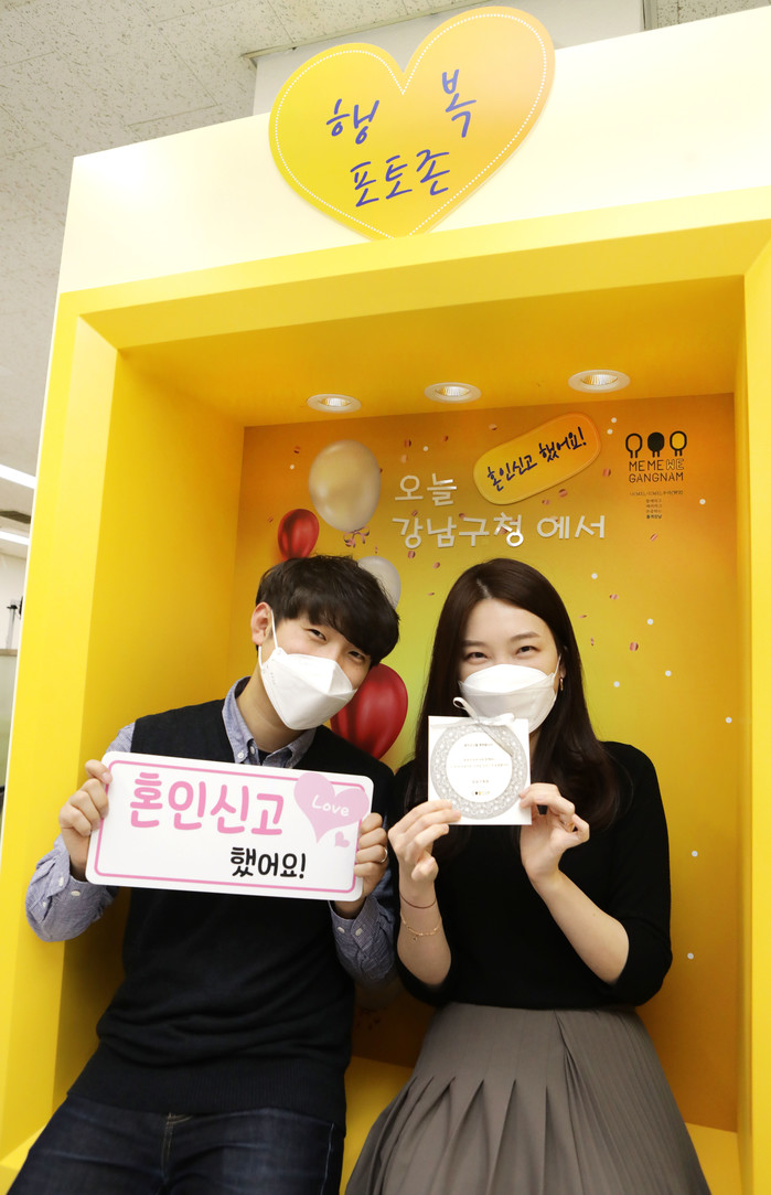 서울 강남구가 구청을 방문한 구민들에게 특별한 날을 기념해 추억을 남길 수 있도록 구청 1층 로비에 ‘축하 포토존’을 설치했다. 사진은 포토존에서 축하 사진을 촬영하고 있는 구민들의 모습. (사진제공=강남구청)