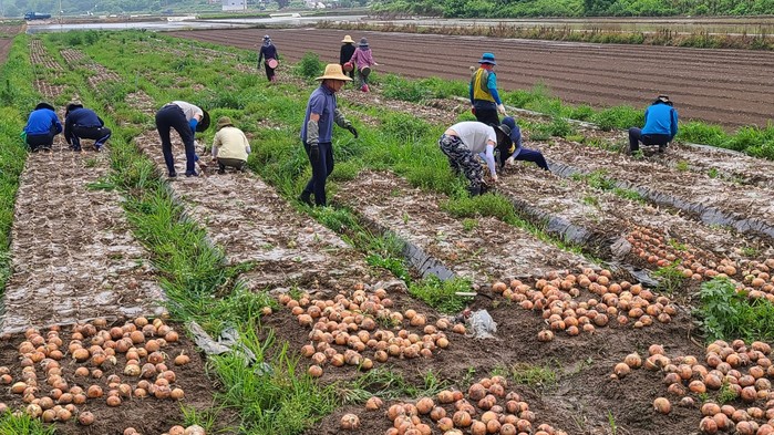 양파 수확이 막바지에 다다른 가운데 농번기 인력난에다 잦은 우천으로 양파수확 작업이 지연되어 어려움을 겪고 있다는 소식에 직원들은 너 나 할 것 없이 팔을 걷어붙여 일손을 도왔다.
