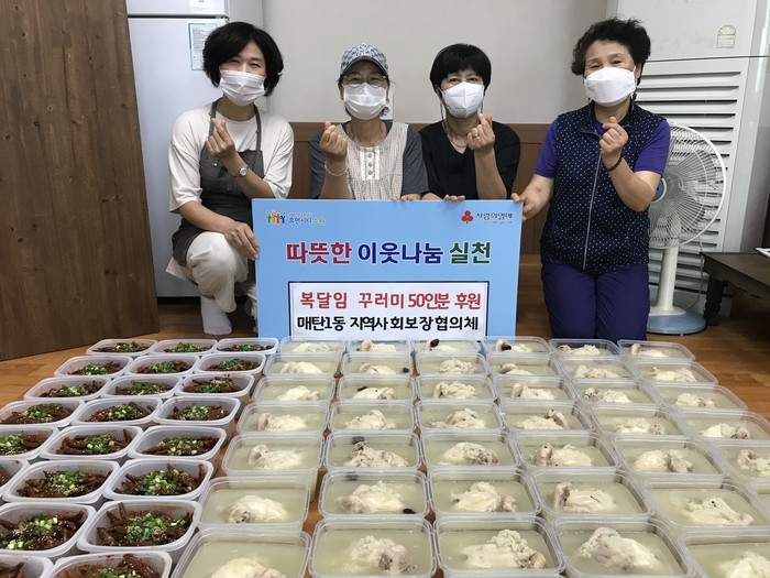 경기 수원시 영통구 매탄1동 지역사회보장협의체는 10일 지역내 홀몸노인 및 지역아동센터 아동 50명을 위해 직접 조리한 삼계탕과 반찬을 넣은 ‘말복 복달임꾸러미’를 지원했다. 사진은 이날 협의체 위원들이 기념촬영을 하는 모습. (사진제공=영통구청)