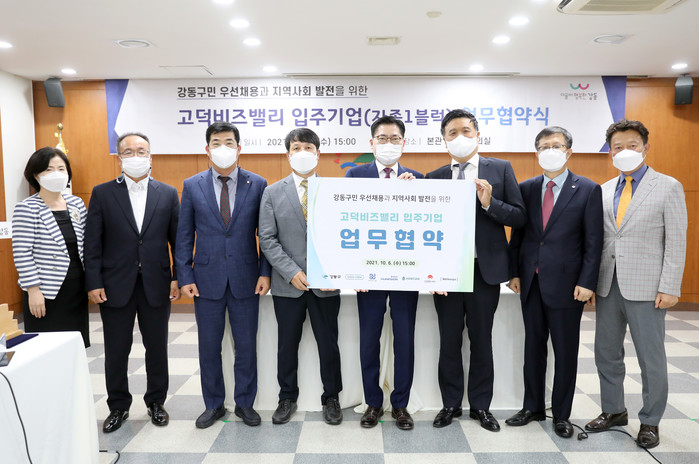서울 강동구는 6일 고덕비즈밸리 자족 1블럭에 입주하는 6개 기업((주)그린스토어·(주)아주디자인그룹·(주)휴네시온·(주)한싹·(주)동해종합기술공사·웰킵스(주))과 ‘강동구민 우선채용과 지역사회 발전을 위한 업무협약’을 체결했다. 협약으로 구와 입주기업은 기업의 조기정착을 위한 행정적 지원 등에 협력하게 된다. 사진은 이정훈 구청장(가운데)과 관계자들이 기념촬영을 하는 모습. (사진제공=강동구청)