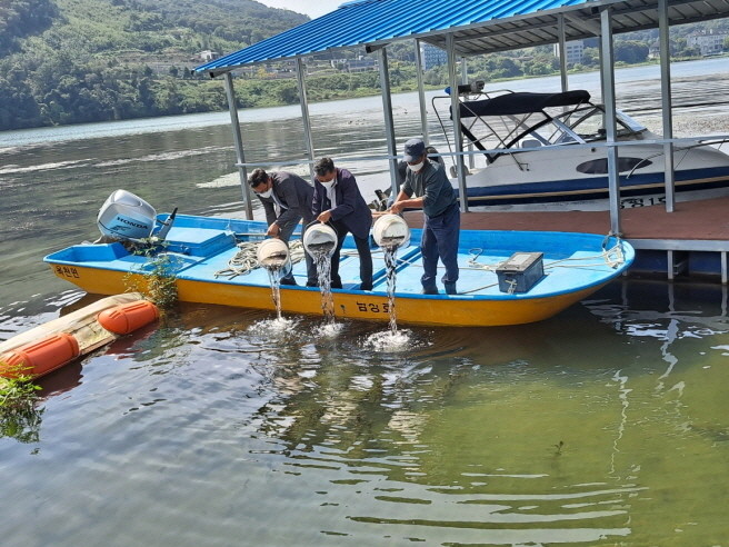 경기 양평군은 내수면 수산자원을 조성하고 어업인 소득증대를 도모하고자 지난 13일 대농갱이 생산업체와 계약을 맺고 치어 8만5000마리를 지역내 남한강에 방류했다. 사진은 이날 치어를 방류하고 있는 모습. (사진제공=양평군청)