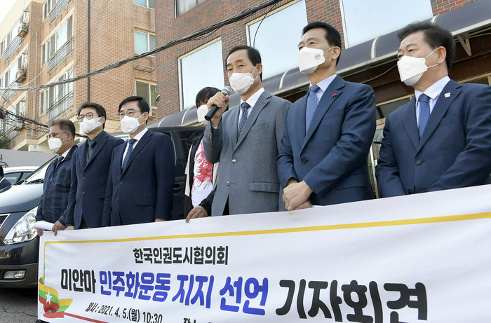 문석진 서대문구청장이 지난 5일 주한 미얀마 대사관 앞에서 미얀마 민주화운동 지지 선언문을 발표했다. 구는 ‘한국인권도시협의회’ 회원도시로, 문 구청장은 협의회 소속 지자체 대표의 일원으로 선언에 참여했다. 사진은 문 구청장(가운데)이 미얀마 민주화운동 지지 선언문을 발표하고 있는 모습. (사진제공=서대문구청)
