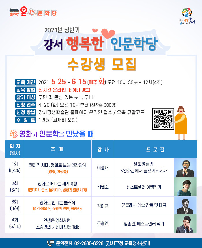 구 관계자는 "코로나19로 지친 구민들을 위해 한 편의 영화를 감상하듯 편안하게 들을 수 있는 주제로 마련했다"라며 "인문학에 대한 갈증도 풀고 세상을 보는 시야도 넓힐 수 있는 의미있는 기회인만큼 많은 분들의 관심과 참여를 기대한다"고 밝혔다.