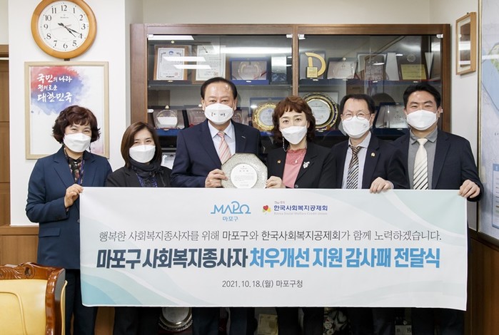 유동균 서울 마포구청장이 18일 한국사회복지공제회로부터 사회복지종사자 처우개선 지원 공로를 인정받아 감사패를 받았다. 구는 올해 사회복지시설 종사자의 본인부담 상해보험료(1만원)를 3403명에게 지원했으며, 전국 기초자치단체 중에서 가장 많다. 사진은 이날 유 구청장(왼쪽에서 세 번째)이 감사패를 전달받고 기념촬영을 하는 모습. (사진제공=마포구청)