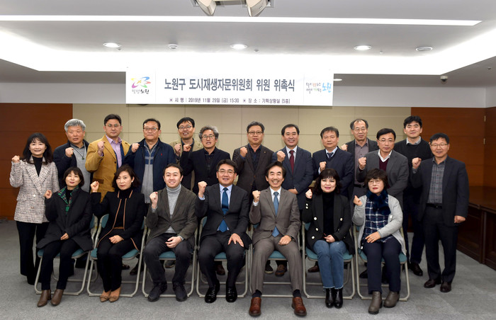 서울 노원구는 최근 구청 기획상황실에서 오승록 구청장을 비롯해 도시계획국장, 미래도시과장 등이 참석한 가운데 ‘노원구 도시재생자문위원회 위촉식’을 개최했다. 사진은 오 구청장(앞줄 가운데)과 참석자들이 기념촬영을 하는 모습. (사진제공=노원구청)