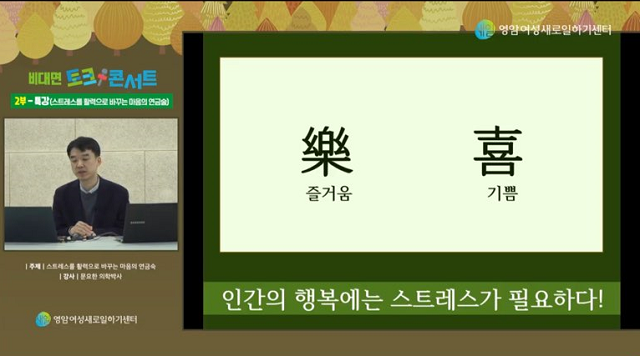 이어 2부에서는 ‘스트레스를 활력으로 바꾸는 마음의 연금술’을 주제로 문요한 의학박사(정신경영아카데미 대표)의 특별강연이 이어졌다. 3부는 ‘지역민을 위한 힐링 콘서트’로 100여 명의 접속자가 참여해 다양한 의견과 신청곡을 요청하는 등 뜨거운 호응을 보였다.