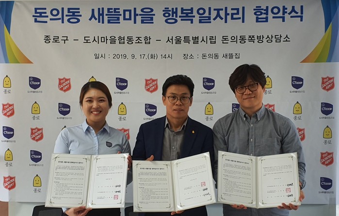 17일 서울 종로구가 돈의동 새뜰마을 주민공동시설인 새뜰집에서 서울특별시립 돈의동쪽방상담소, 도시마을협동조합과 ‘돈의동 새뜰마을 행복일자리 협약’을 체결했다. 사진은 협약식 후 기념촬영을 하고 있는 관계자들의 모습. (사진제공=종로구청)