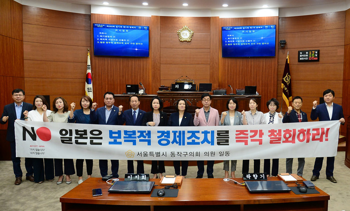 [시민일보 = 여영준 기자] 서울 동작구의회(의장 강한옥)가 지난 12일 하루 일정으로 제293회 임시회를 열어 ‘일본 경제보복 조치 규탄 결의안’을 채택했다.