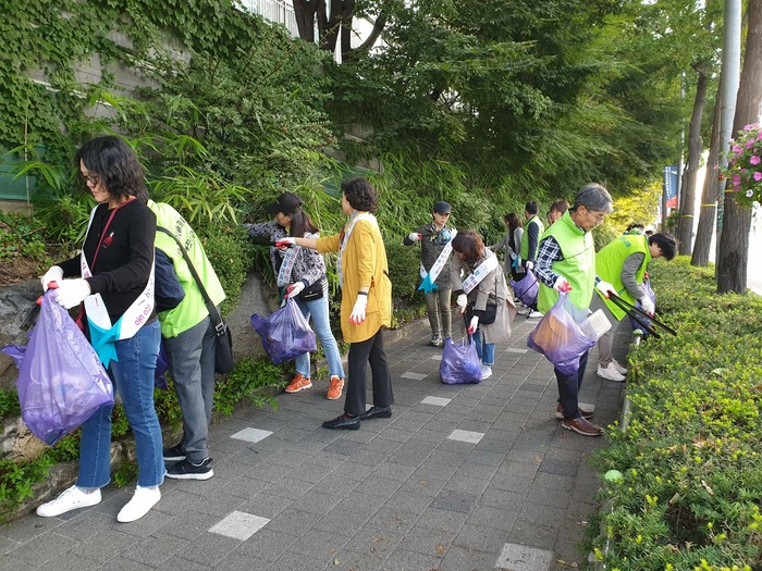 서울 강동구가 지난 25일 ‘제100회 전국체육대회’ 및 ‘제39회 전국장애인체육대회’를 기념해 천호대로 일대를 중심으로 보도, 가로변 녹지대, 버스정류장 등을 집중적으로 손님맞이 대청소를 실시했다. 사진은 청소를 하고 있는 봉사자들의 모습. (사진제공=강동구청)