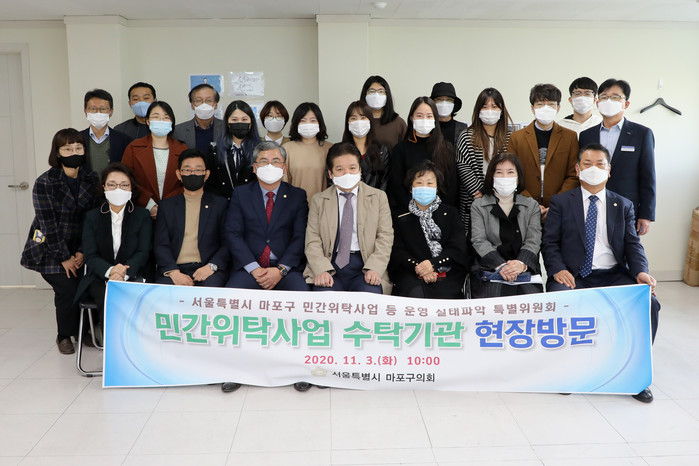 | ▲ 민간위탁특별위원회가 민간위탁사업 수탁기관 현장을 방문한 후 기념촬영을 하는 모습. (사진제공=마포구의회) |