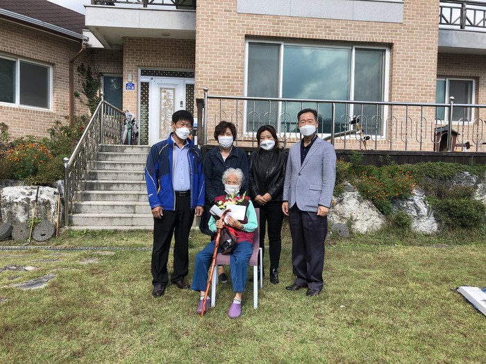 경기 광주시 곤지암읍은 최근 지역내 유일하게 100세를 맞은 장수 노인에게 장수지팡이 ‘청려장’과 대통령 축하서한을 전달했다. 사진은 이날 청려장과 대통령 축하서한 카드를 받은 100세 노인과 관계자들이 기념촬영을 하는 모습. (사진제공=광주시청)