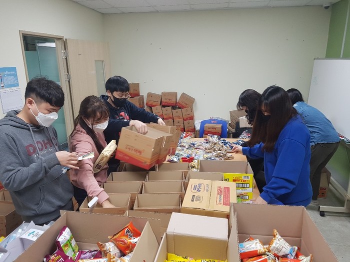 인천 부평구 청소년상담복지센터와 청소년지원센터 꿈드림은 최근 코로나19 사태로 휴관이 길어짐에 따라 센터에 나오지 못하는 청소년들에게 두 번째 관심박스를 배송했다. 사진은 센터 관계자들이 떡볶이 재료, 과자, 손 소독제 등을 담고 있는 모습. (사진제공=부평구청)