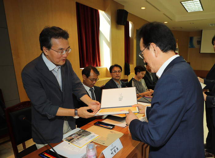 서울 강남구가 최근 구청 3층 회의실에서 행복정책분야 교수, 전문가 등 15명으로 구성된 행복자문단을 출범하고 첫 회의를 열었다. 사진은 위촉장을 전달하고 있는 정순균 구청장(오른쪽)의 모습. (사진제공=강남구청)