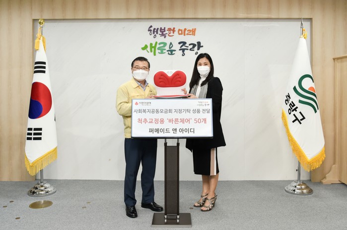 서울 중랑구는 6일 퍼메이드 앤 아이디, (주)유비이엔지로부터 저소득 주민들을 위한 척추교정용 전문의자 50개와 KF94 마스크 5000장을 전달받았다. 사진은 전달식에서 류경기 구청장(왼쪽)이 퍼메이드 앤 아이디로부터 척추교정용 전문의자 50개를 전달받고 있는 모습. (사진제공=중랑구청)