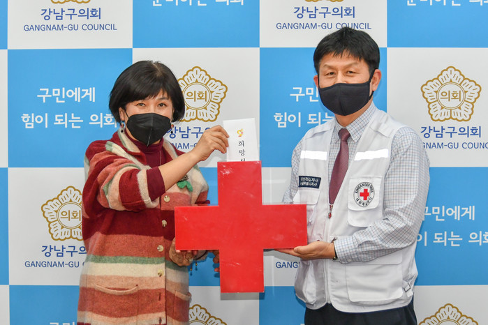| ▲ 이향숙 강남구의회 운영위원장(왼쪽)이 대한적십자사에 특별회비를 전달하고 있다. (사진제공=강남구의회) |