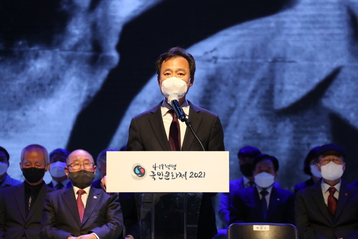 서울 강북구가 지난 18일‘4.19혁명 국민문화제 2021’ 전야제와 락(樂) 뮤직 페스티벌을 비대면으로 실시해 유튜브·페이스북에서 생중계했다. 사진은 이날 행사에 참석한 박겸수 구청장(앞줄 가운데)과 내빈들의 모습. (사진제공=강북구청)