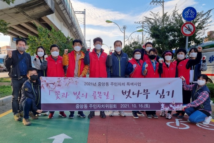 경기 동두천시 중앙동 주민자치위원회는 최근 2021년 중앙동 주민자치특색사업인 '꽃과 빛의 골목길' 벚나무 심기를 추진해 주변 환경을 깨끗이 정리하며 동두천중앙역과 보산역 사이 지하철 하부 유휴공간에 벚나무 25그루를 심었다. 사진은 이날 참여한 봉사자들이 기념촬영을 하는 모습. (사진제공=동두천시청)
