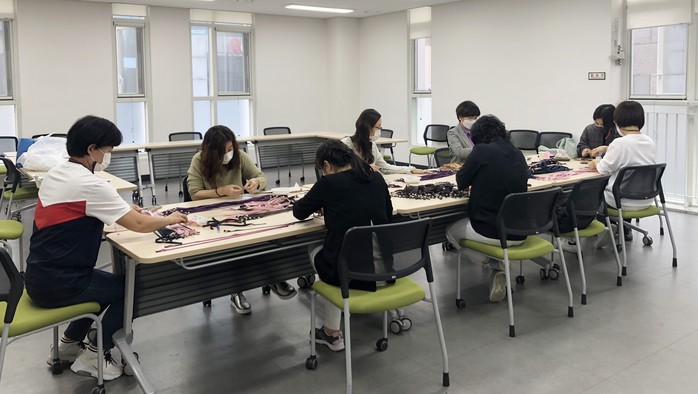 경기 수원시 영통구 영통2동은 13일 지역 기초생활수급자 등 코로나19 감염 취약주민 및 지역내 유관기관을 대상으로 코로나19 예방과 극복을 위한 마스크 목걸이 나눔을 실시했다. 마스크 목걸이는 영통2동 주민자치위원회 위원과 수원시 자원봉사센터 자원봉사자 등 약 20여명이 직접 제작했다. 사진은 관계자들이 목걸이를 만들고 있는 모습. (사진제공=영통구청)
