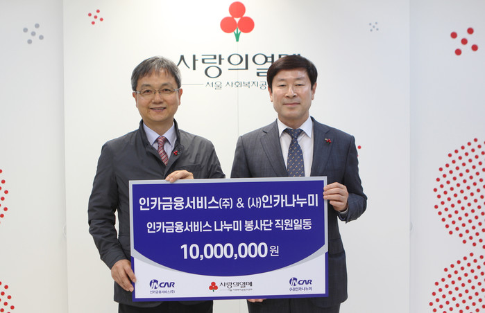 서울 사회복지공동모금회(서울사랑의열매)가 인카금융서비스(주)와 (사)인카나누미로부터 코로나19 극복을 위한 성금 1000만원을 전달받았다. 사진은 기부금을 전달받고 기념촬영을 하고 있는 서울사랑의열매 사무처장(왼쪽)과 최병재 인카금융서비스(주) 대표이사의 모습. (사진제공=서울사랑의열매)