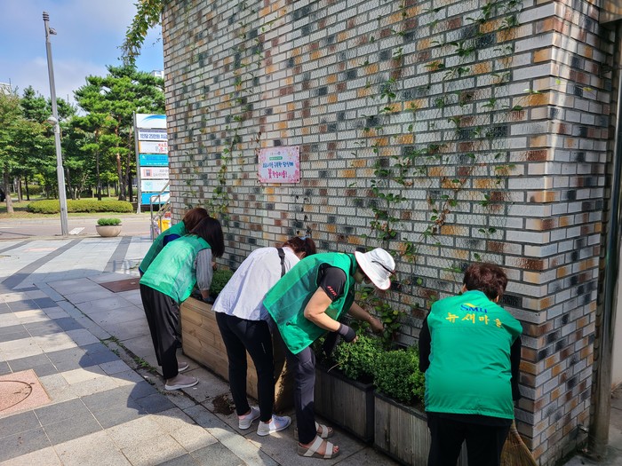 경기 김포시 구래동은 최근 가을을 맞아 이틀간 청사 주변 및 버스정류장 12곳에 국화 300여본을 식재했다. 사진은 이날 참여한 구래동 새마을남·녀지도자들이 국화를 심고 있는 모습. (사진제공=김포시청)