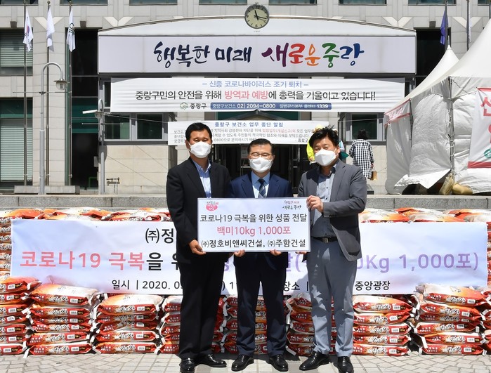 서울 중랑구는 13일 구청 중앙광장에서 (주)정호비앤씨건설, (주)주함건설로부터 10kg 백미 1000포를 기탁받았다. 백미는 (사)서울시지체장애인협회 중랑구지회, 중랑푸드마켓(면목점·신내점), 지역내 주민센터를 통해 코로나19로 어려움을 겪는 저소득층 주민에게 전달될 예정이다. 사진은 류경기 구청장(가운데) 및 관계자들이 기념촬영을 하는 모습. (사진제공=중랑구청)
