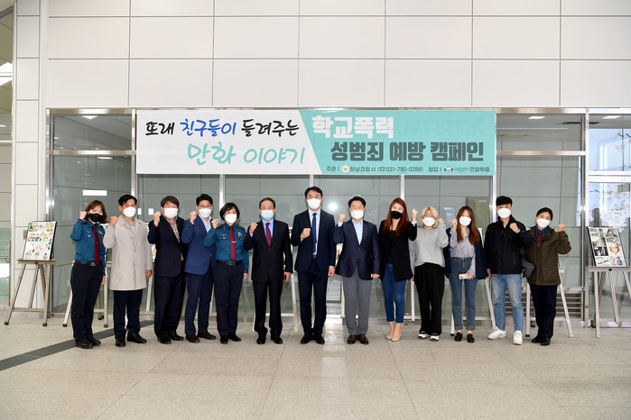김상호 경기 하남시장은 최근 하남경찰서와 애니윈만화학원이 협업해 하남시청역에서 오는 5월16일까지 진행하는 ‘청소년 학교폭력·성범죄 예방 만화 전시전’에 참석했다. 사진은 전시회에서 김 시장(가운데)이 관계자들과 기념촬영을 하는 모습. (사진제공=하남시청)