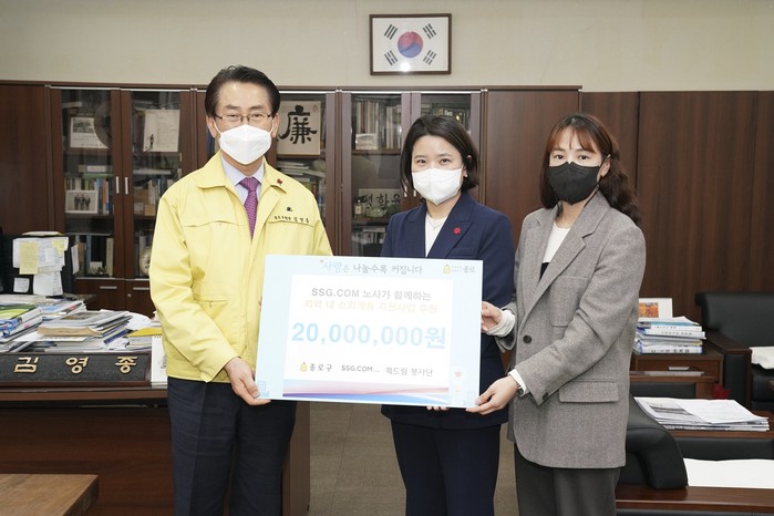 서울 종로구는 지난 15일 쓱드림 봉사단으로부터 지역내 저소득층 지원 사업을 위한 성금 2000만원을 기탁받는 ‘쓱드림 봉사단 기부금 전달식’을 개최했다. 사진은 전달식에서 김영종 구청장(왼쪽)과 관계자들이 기념촬영을 하는 모습. (사진제공=종로구청)