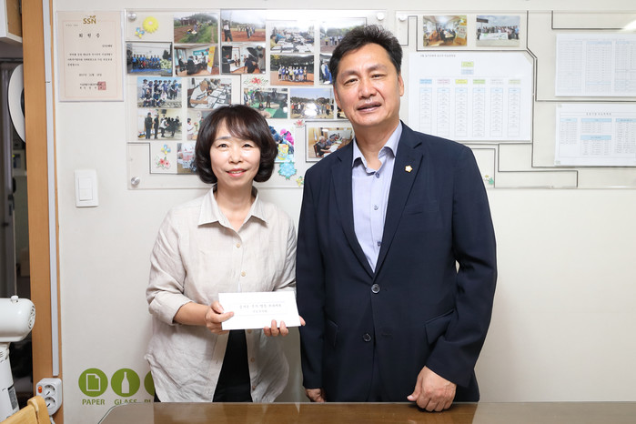▲ 사회복지단체 길가온혜명 시설장에게 추석위문 격려금을 전달하고 있는 박칠성 의장. (사진제공=구로구의회) |