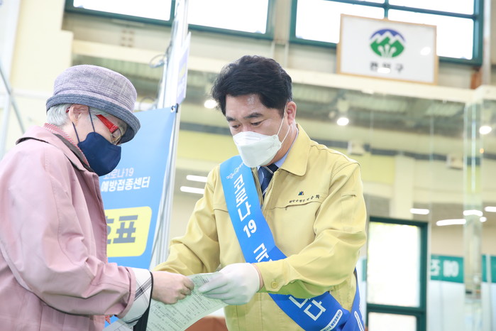 박준희 서울 관악구청장이 최근 지역 재난안전대책본부장으로서 정부 백신접종의 안정성에 대한 구민들의 신뢰도와 참여도를 높이기 위해 관악구 보건소에서 아스트라제네카(AZ) 코로나19 백신을 접종했다. 사진은 박 구청장(오른쪽)이 관악구 예방접종센터에서 접종 안내를 하고 있는 모습. (사진제공=관악구청)